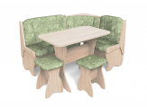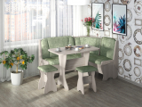 Набор мебели для кухни, включающий в себя угловую скамью, стол и два табурета. В угловой скамье под сиденьями расположены два ящика. Каркас ЛДСП. Покрытие верхней части столешницы стола - термостойкий пластик, кромка ПВХ - 1мм. Углы столешницы закруглены для избегания травмирования и придания лучшего эстетического вида.