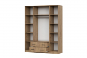 Шкаф комплектуется четырьмя распашными створками и разделен вертикальными перегородками на три отделения. По краям располагаются бельевые отделения шириной 384 мм. В каждой из них устанавливается по четыре полки. Посередине отделение шириной 768 мм. В нижней части отделения расположена секция с двумя выдвижными ящиками, в верхней - платяное отделение высотой 1512 мм с одной полкой сверху и металлической штангой.