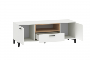 Тумба под ТВ с выдвижным ящиком на шариковых направляющих, с двумя распашными дверцами и открытой полкой.